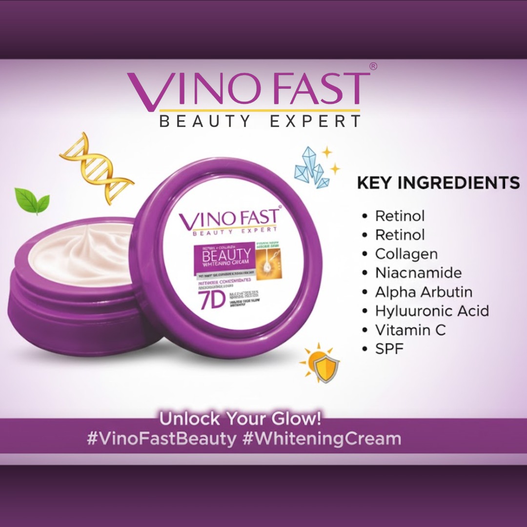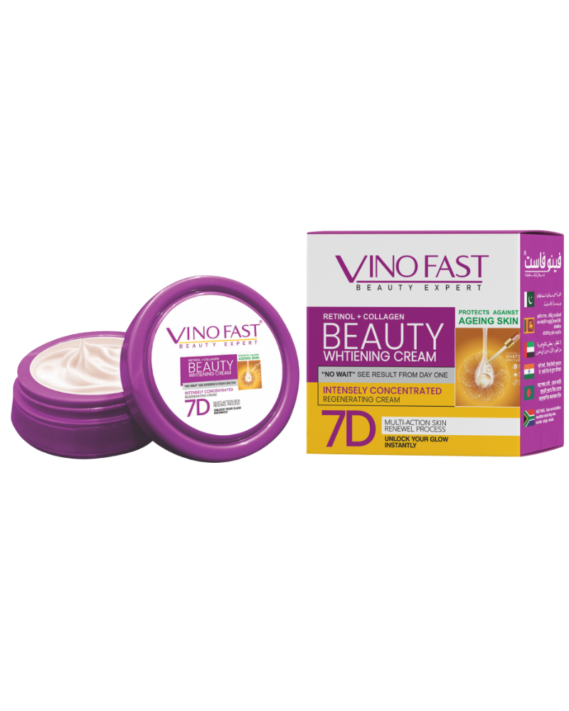 Experience visibly fairer, smoother, and youthful skin with Vino Fast Beauty Whitening Cream 7D. Enriched with Retinol and Collagen, this advanced formula brightens your complexion, fights signs of ageing, and unlocks your natural glow — starting from the very first use.